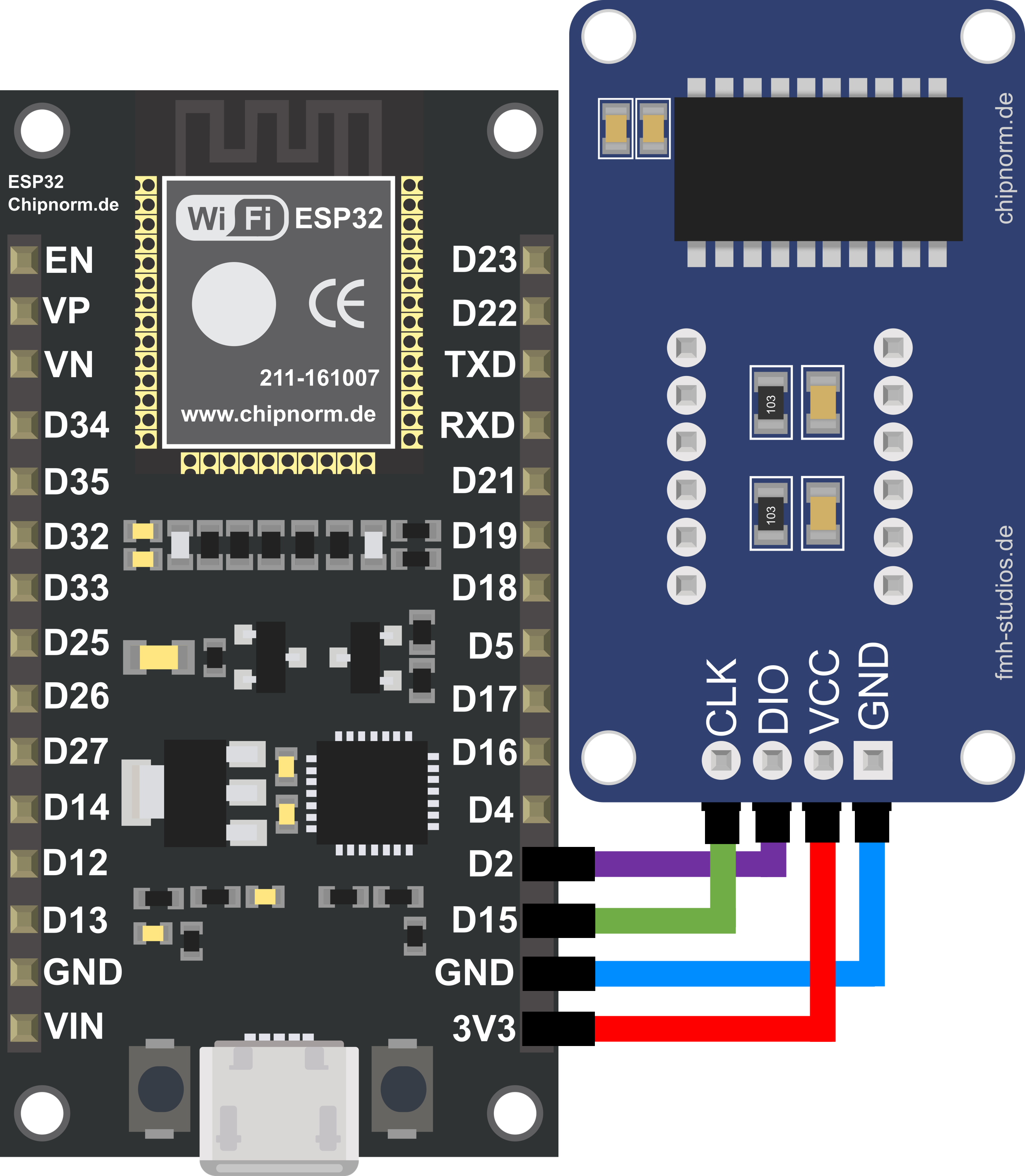 Der Aufbau ist sehr übersichtlich und schnell erledigt. Um das 4x7Segment-Modul TM1637 mit deinem ESP32 zu verbinden, nutzt du lediglich vier Kabel. Zunächst verbindest du die Spannungsversorgung: Schließe 3,3V des ESP32 an VCC des Moduls und GND an GND an. Für die Datenkommunikation verwendest du die Pins D15 des ESP32 für CLK und D2 des ESP32 für DIO.