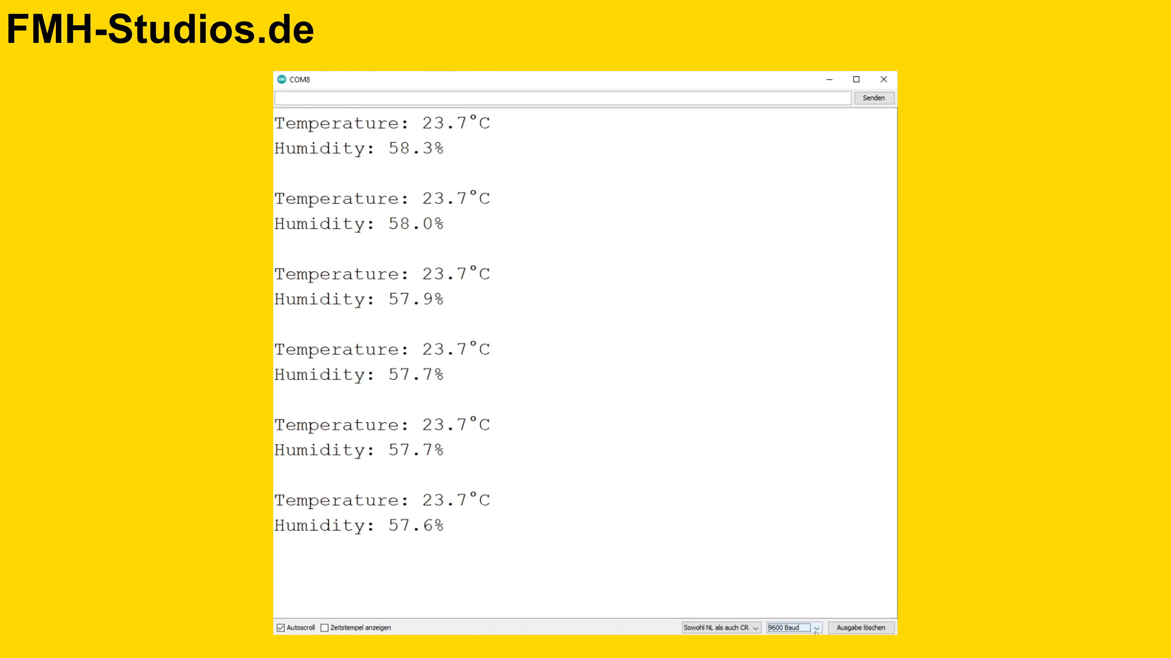 Werte anzeigen: Nun wird dir im seriellen Monitor kontinuierlich die aktuelle Temperatur in Grad Celsius (°C) und die relative Luftfeuchtigkeit in Prozent (%) angezeigt, welche der GY-21 / SHT21 misst.