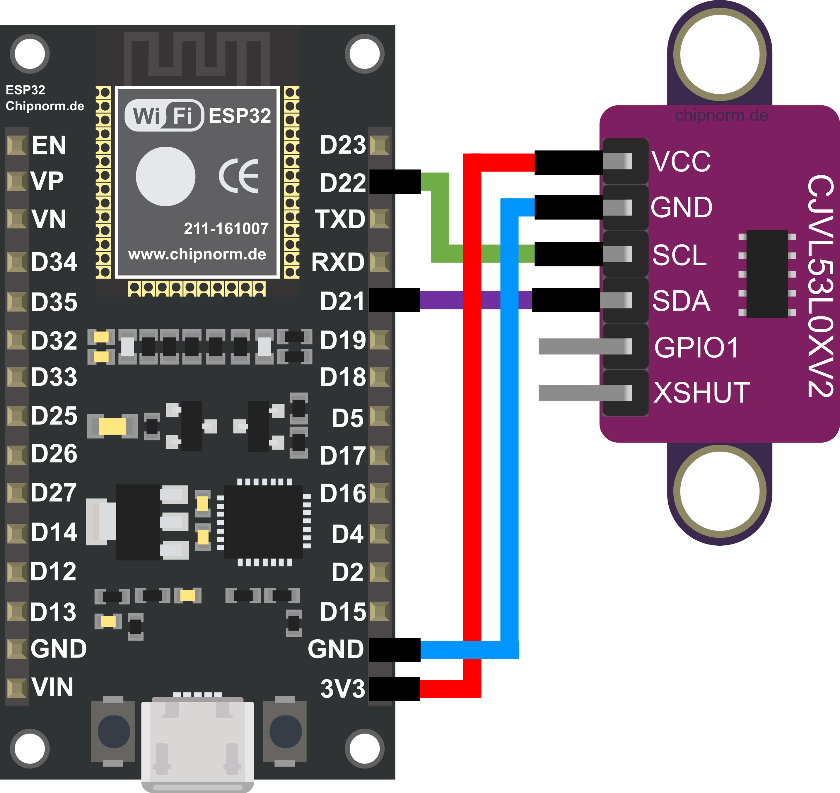 Der Aufbau der Schaltung zwischen dem ESP32 und dem VL53L0X Sensor ist unkompliziert und erfolgt über nur vier Verbindungen, da wir das I2C-Protokoll für die Datenübertragung nutzen. Um den VL53L0X mit der nötigen Betriebsspannung zu versorgen, verbindest du den 3,3V-Ausgang des ESP32 mit dem VIN-Pin des Sensors und den GND-Pin des ESP32 mit dem GND-Pin des Sensors. Für die Datenkommunikation schließt du den D22-Pin (SCL) des ESP32 an den SCL-Pin des VL53L0X und den D21-Pin (SDA) an den SDA-Pin des Sensors an.